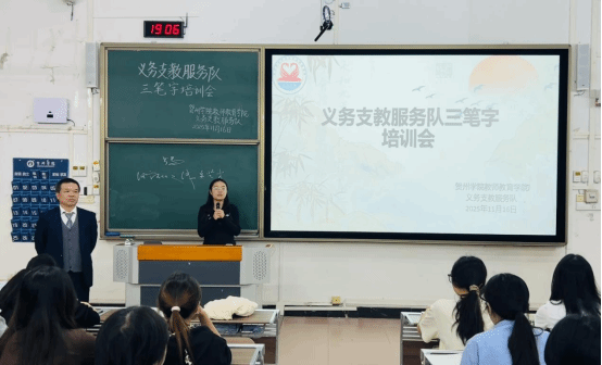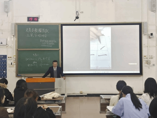 2025年11月16日晚19:00,贺州学院西校区乐教楼A105教室内暖意融融——退休不退志的韦祖庆教授,以《书写,汉字文化之线条艺术》为教师教育学院义务支教服务队队员开展书法专题培训,在笔墨间架起了书法技艺与教育智慧的联结桥梁。