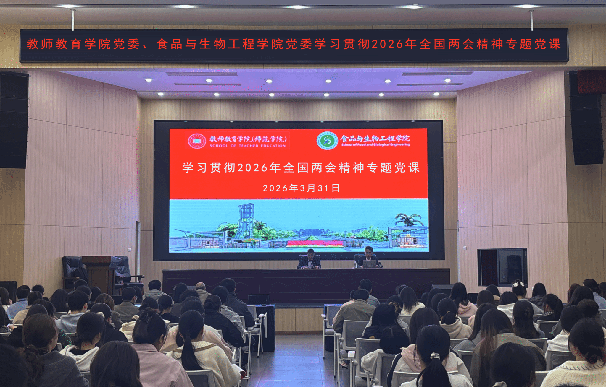3月31日下午,我院党委联合食品与生物工程学院党委在自强楼学术报告厅109会议室举办学习贯彻2026年全国两会精神专题党课。党课由学校党委理论宣讲团成员聂文凯老师主讲,教师教育学院、食品与生物工程学院全体师生党员参加。