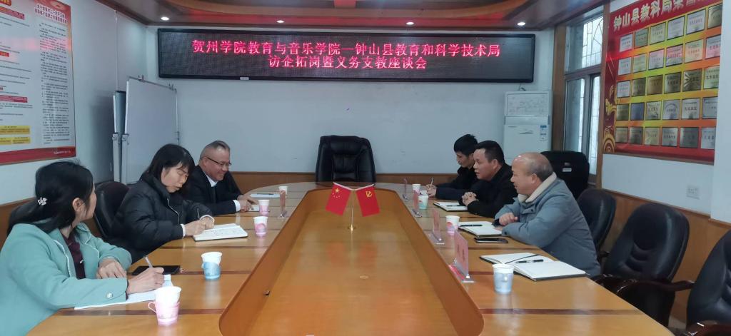 为持续推进“访企拓岗促就业”专项行动,拓展2023届毕业生就业求职渠道,促进毕业生更充分更高质量就业,12月9日上午,教育与音乐学院赴钟山县教育和科学技术局开展“访企拓岗促就业”暨“义务支教”调研活动。学院党委书记陈家群、院长蒲日材、副院长陈东云、副院长周琴以及钟山县教育和科学技术局局长钟凯兵、副局长盘娇花参与此次调研活动。
