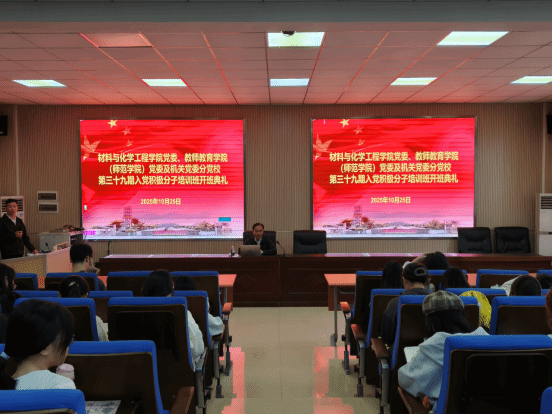 2025年10月25日上午,教师教育学院(师范学院)、材料与化学工程学院(碳酸钙产业学院)及机关党委分党校在逸夫楼111学术报告厅联合举行第三十九期入党积极分子培训班开班典礼。材料与化学工程学院党委书记(分党校校长)莫达隆、材料与化学工程学院专职组织员(分党校班主任)义国杰和84名入党积极分子参加,开班典礼由义国杰主持。